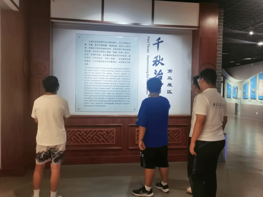 进入第三展区“千秋治河”,墙上的历史诉说着彼时黄河“三年两决口、百年一改道”,水患频发,给中华儿女带来的无尽灾难。这里展出的镇馆之宝——郑工合龙碑、明代《河防一览图》、宋代黄河分段管理的界碑——埄堠碑等一一展现了先民丰富的治河思想和技术。实践队员行至行至治河新篇、和谐之路展区,观看中国共产党领导下的人民治黄史。实践队员们不但感受到了黄河那一泻千里、势不可挡的气势,更感受到了中华儿女坚贞不屈、矢志不渝的信念,这便是中华民族亘古绝世、生生不息的铁脊梁、国之魂!