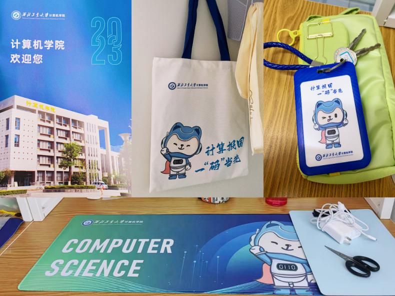 为了欢迎新同学,学院为每一位新生都准备了精心制作的文创礼包,包含致新生的一封信、印有学院IP卡通人物的帆布包、定制的鼠标垫及“一卡通”卡套等,富有创意的精美文创深受同学们的喜爱。