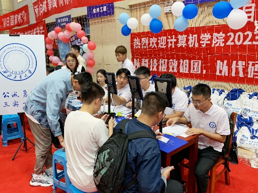 为了做好这次迎新,学院提前谋划部署了迎新准备工作。学院团委老师靳宇琪、学生干部及志愿者提前对场馆内外的学院点位进行了精心布置,围绕“计算报国,一码当先”的迎新主题,在迎新区域张贴了妙趣横生的迎新横幅,布置了精美的主题展板,营造出一派温馨热烈的迎新氛围。在场馆内外还布置了展示学院特色的趣味合影框,并提供手持标语卡供新生们打卡拍照留念,同时在场内报到点位摆放校徽图案的指印印章图,供每位新生在完成报到手续后按压手印……一系列精心的布置与活动为前来报到的新生及家长们带来了充满仪式感的报到体验及强烈的归属感。
