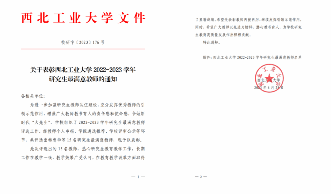 优秀博士学位论文”,13名同学入选西工大优秀硕士毕业生,1名同学入选西工大优秀博士毕业生。