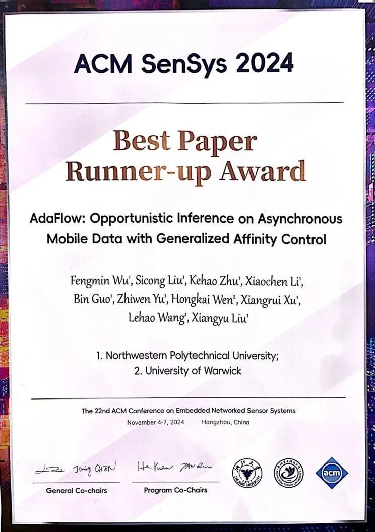 2024年11月,第22届ACM Conference on Embedded Networked Sensor Systems(ACM SenSys 2024)在浙江杭州举办,刘思聪副教授指导硕士生完成的论文获得Best Paper Award Run-up。