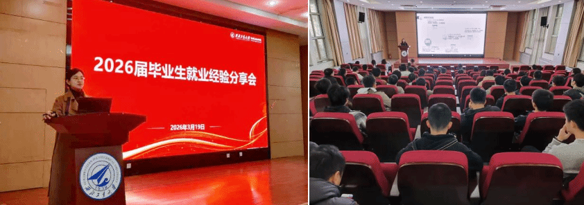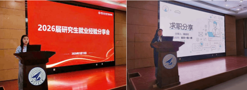 在新报告厅举办2026届毕业生就业经验分享会,邀请同届硕士毕业生魏佳何、卫嘉丽、李璐池、潘成宇及本科毕业生杨裕平,为学院学生提供求职就业指导。学工主管刘百芳、硕士研究生及本科生100余人参加。会议由学院研究生会执行主席李杨梅主持。