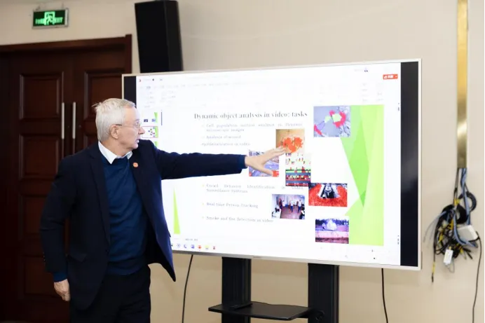 对白俄罗斯国立大学学者的到来表示欢迎,对学院发展、学科建设和合作意向进行了介绍。接着,谢尔盖·弗拉基米罗维奇·阿布拉梅伊科教授和米哈伊尔·茹拉夫科夫教授并分别开展了题为《Dynamic Objects Motion Analysis in Video Using Optical Flow and Neural Networks》及《Science and educational activity of Mechanics and Mathematics in Belarusian State University》的精彩报告。就团队所研发的基于整体光流和神经网络模型的移动目标运动分析的相关工作及学院的基本情况、学科方向进行了介绍。学院师生聆听了讲座并与外方专家进行了有益的交流。在提问与讨论环节,两位白俄罗斯教授详细解答了师生们的多个问题,并给出具体的指导和建议。讨论氛围热烈,气氛活跃,参会师生受益匪浅。
