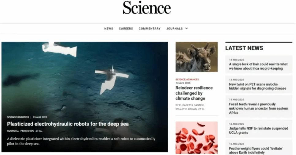 近日,我院人机物融合智能计算团队负责人於志文教授参与完成的最新研究成果“Plasticized electrohydraulic robot autopilots in the deep sea”被国际顶级期刊《Science Robotics》录用并在线发表。该研究面向高温、低压等极端条件下的深海高端装备领域,成功研发了新一代海洋软体机器人,并在1369米深度冷泉区和4070米深度海山区成功测试部署,获得了《Science》期刊官方主页专题报道。该成果由哈尔滨工程大学、西北工业大学、浙江大学、同济大学等单位共同完成。
