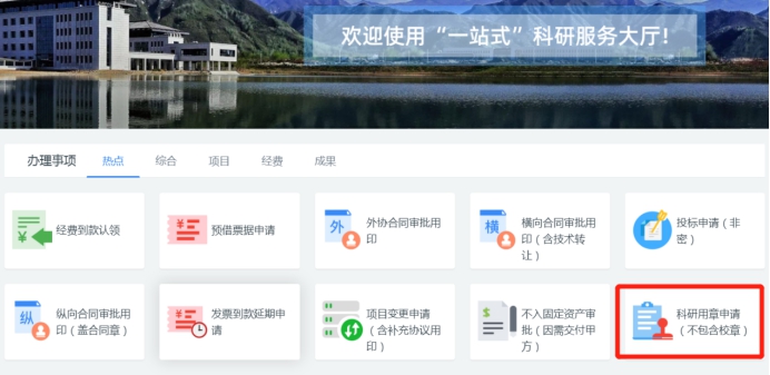 2. 办理地址:登录翱翔门户,点击“科研系统”进入系统主页;在主页办理事项栏选择“科研用章申请”。