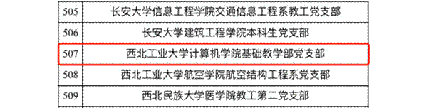 2018年11月30日,根据《教育部办公厅关于开展新时代高校党建示范创建和质量创优工作的通知》(教思政厅函〔2018〕23号)安排和评审工作方案,经资格审查、专家通讯评审、教育部党建工作领导小组成员单位集中审议,遴选产生了10个党建工作示范高校、100个党建工作标杆院系、559个党建工作样板支部,西北工业大学计算机学院基础教学部党支部光荣入选“全国党建工作样板支部”。