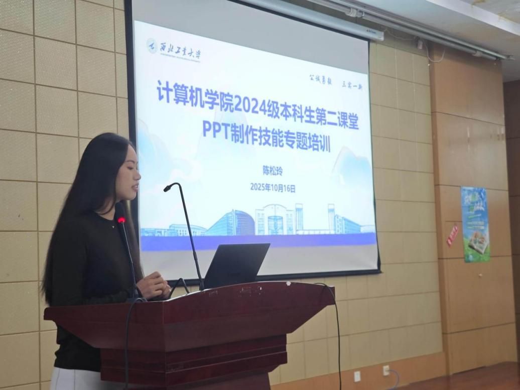 兼职辅导员陈松玲则以“做饭”为喻,生动形象地讲解了PPT制作的逻辑与技巧,包括内容组织、视觉呈现及读者体验等。