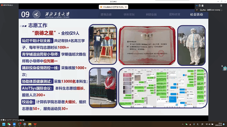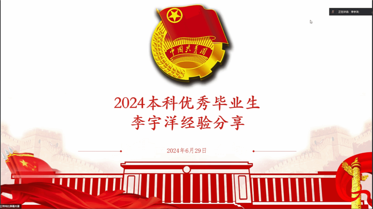 6月30日,计算机学院本科2023级DL062325、DL062326、DL062329三个团支部在学院团委指导下联合举办了优秀学生标兵经验分享会,共同于线上开展了这场特别的主题团日活动。本次分享会特别邀请到学校2024本科优秀毕业生李宇洋和2024年五四红旗标兵张田田两位学院优秀学子为2023级团员青年分享了个人的成长经历及学习、科研、推免等相关经验。会议由DL062326支部团支书王玮祎主持,团委书记靳宇琪及来自于本科2023级的60余名团员青年参加。