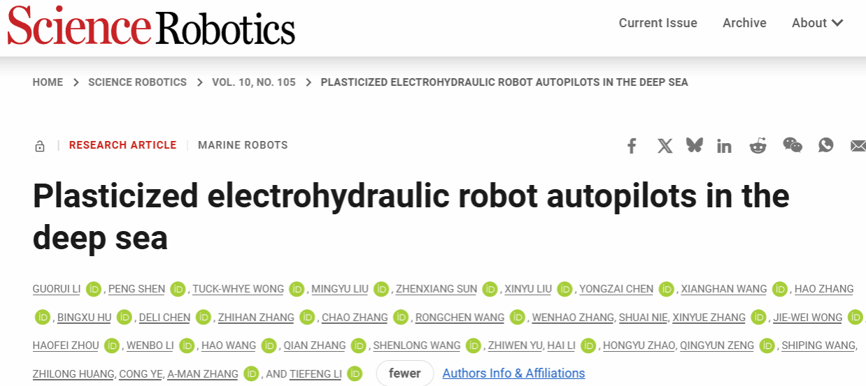 近日,我院人机物融合智能计算团队负责人於志文教授参与完成的最新研究成果“Plasticized electrohydraulic robot autopilots in the deep sea”被国际顶级期刊《Science Robotics》录用并在线发表。该研究面向高温、低压等极端条件下的深海高端装备领域,成功研发了新一代海洋软体机器人,并在1369米深度冷泉区和4070米深度海山区成功测试部署,获得了《Science》期刊官方主页专题报道。该成果由哈尔滨工程大学、西北工业大学、浙江大学、同济大学等单位共同完成。