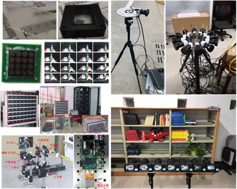 4) 计算摄像研究环境。拥有可变参数的聚焦式光场相机、阵列式光场成像系统、面向移动设备的微相机阵列光场成像装置、编码孔径光场相机。在自研光场相机的基础上,项目组研制全景光场采集及自由视点合成渲染系统、高质量光场采集及密集光场重建系统统筹等。详见。